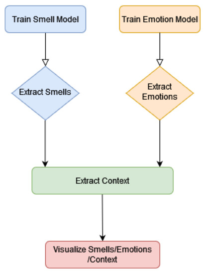Zwaan et al. [85] present an appealing work on the applications of the Historic Embodied Emotion Model (HEEM) to emotions in historical texts. Research involving measuring self-reported affective responses to odors and odorous products by Ferdenzi et al. [86] resulted in the development of the cross-cultural Emotion and Odor Scales (EOSs). In this paper, we are using state-of-the-art text mining techniques to address the domain of smells (or odors) in connection with emotions in literature texts. The primary research goal of the paper is measuring self-reported affective responses to odors and odorous products.