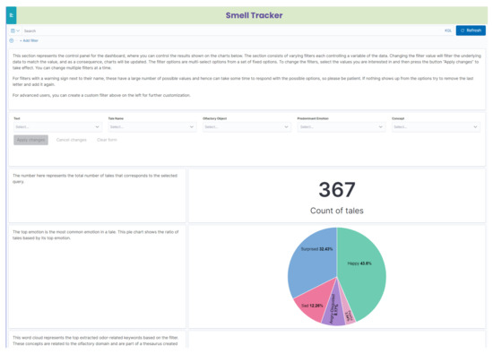 The dashboard can be split into three parts managed by a control panel, where the results can be filtered through keyword search, olfactory object, concept, tale name, and predominant emotion. Upon applying the filters, the records will be filtered to these matching the condition, and the results of all the analyses will be updated accordingly.