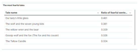 Furthermore, using the tales’ emotion distribution, the top tales for each emotion are shown along with the percentage of sentences with that particular emotion. In Figure 3, we see the tales with the largest ratio of fearful sentences.