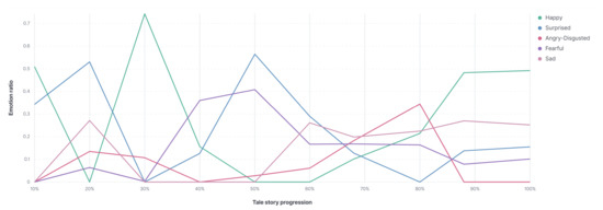 The tales’ timeline focuses on the tales’ emotional progression throughout the tale. It shows the evolution of events by means of emotions throughout the story and helps observe the different story lines, such as tales with happy endings, cautionary tales, etc. The timeline is calculated by splitting each tale into 10 chunks, and for each chunk, the number of sentences that fall under it and that have a particular emotion are calculated. The intensity score represents the share of sentences that have a particular emotion in that chunk from the total number of sentences in that chunk. By filtering for a specific tale, one can observe the story timeline for that particular tale; alternatively, by filtering for a specific concept, it shows the average emotional timeline for all tales that share this concept. Figure 5 shows the emotional storyline progression of the tale “The Frog King or Iron Heinrich”. A more detailed sentence-by-sentence emotions’ list is found in Appendix A.