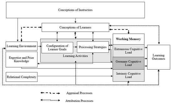 The original model suggests that self-regulated learning is influenced by several factors that cause different kinds of cognitive load in the working memory [30]. The activated types of cognitive load substantially impact learning outcomes. Central aspects of the original model are: the design of learning environments, learner conceptions, and information processing that affect each other, (e.g., positive or negative attitudes towards computers that might influence information processing in computer-mediated learning [31,32]). Concerning these aspects, it is necessary to specify the model thereby focusing on two processes that we already discussed: appraisal and attribution. The original model illustrates learners’ expectations as part of their conceptions, and it highlights the influence of these expectations on cognitive processes, (e.g., elaboration processes) and goal development. However, the influence of learners’ expectations needs to be elaborated further. Therefore, we suggest that appraisal and attribution processes do not only influence immediate learning activities, but that they also affect learners’ perception of the learning environment, invested mental effort, cognitive load, and thus, learning outcomes. This is more of an iterative feedback process than a unidirectional relationship. First, learners work with a specific medium—for instance, a textbook—and assume this medium to be difficult to learn with. Hence, learning environments that mainly refer to textbooks as learning resources are expected to be more demanding than other learning environments, such as learning software [33]. Consequently, greater mental effort is invested in processing the information presented in the learning environment. This, in turn, leads to the activation of prior knowledge. Then, active and elaborated information processing activates germane cognitive load. Finally, this process leads to better learning outcomes than an appraisal process that judges a specific medium as easy to learn with. Moreover, this appraisal process is likely to interact with attribution processes [34]. As depicted in the work by Salomon and colleagues [25,35], success in learning outcomes can be attributed in different ways. If learners invest greater mental effort (especially germane cognitive load as highlighted in Figure 1) in processing the content of a medium, they are more likely to attribute successful learning to their own abilities and effort rather than to the medium itself. In contrast, an unfamiliar medium that is estimated to be easy to learn with requires greater mental effort for information processing. This external attribution leads to overgeneralization and appraisal processes that support a generalized and disadvantageous surface information processing strategy concerning these specific media (self-fulfilling prophecy).