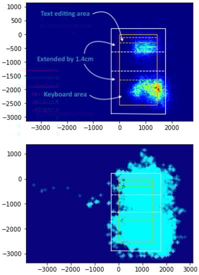 A solution that excludes these out-of-bounds gazes could be problematic, since it would result in significant data loss. To mitigate the problem of data loss due to these inaccuracies, in Jiang et al.’s paper, it is mentioned that the boundaries of the keyboard and text editing area were expanded by 1.40 cm in all directions. Based on the device screen physical dimensions (≈63.51 mm × 112.9 mm) and pixel density (≈226 ppcm), this translates to an additional 317 pixels in each direction. The size of the extended area is shown in Figure 1 (top). This is a rather generous increase—in fact, it means that the total area being used to consider gaze coordinates as being “on-device” is 74.21% larger than the area covered by the actual device screen. Without this area expansion, only 70.24% of the gazes fit the screen device bounds. As a result of this expansion, 93.47% of gaze points data could be included in any analyses by Jiang et al.