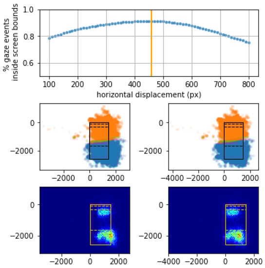 Percentage of gaze data within device boundaries after shifting at each linear step (top). The orange line shows optimal shifting at 460 px to the left. Results of the shifting at the optimal point are shown with raw gaze points and 2D-histogram visualisations (left: original data, right: after shift).