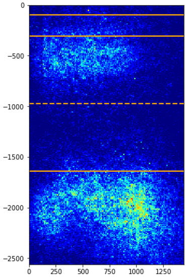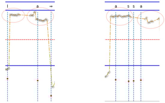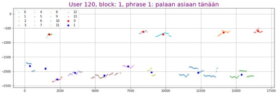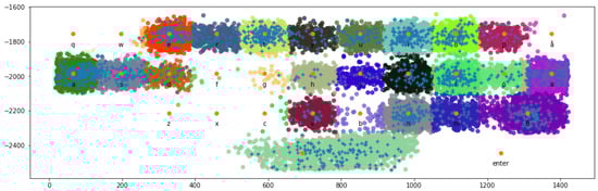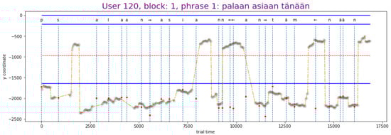 Since the precise font sizes in pixels were not available in Jiang et al.’s paper, an appropriate font size was estimated, based on the visual proportions demonstrated in the paper’s accompanying video at https://userinterfaces.aalto.fi/how-we-type-mobile/ accessed on 10 August 2022. From this exercise, we note that in fact, the maximum phrase length (calculated at 1041 px, 72.29% of the available screen width) explains this concentration of the gaze cluster to the leftmost of the screen (shifted gaze data upper cluster horizontal coordinate px, px, px, 78.70% of gazes between ). Based on the above observations, and that the horizontal shift brought of the gaze data into the upper part area of the screen bounds, it seemed unnecessary to make any other transformation adjustments to the text editing area gaze data. The correspondence of the gaze cluster horizontal coordinates with the screen coordinates of the text being input, provides further assurance that the transformation step taken earlier was correct.