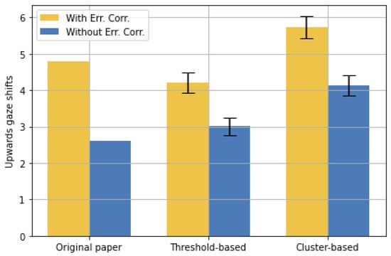 Considering the breakdown of these findings across sentences with and without error correction, Jiang et al.’s paper does not explicitly mention precise values, but the related figure shows that the mean number of gazes to the text editing area is <5 ( 4.8) for sentences with error corrections and <3 () for those without. Results from the independent work in this paper verifies Jiang et al.’s finding that sentences that contain error corrections have, on average, more gaze shifts to the upper area of the keyboard, with both gaze classification methods. Using the threshold-based method, mean values are at (with errors) and (no errors), while the cluster-based method shows mean values at (errors) and (no errors). It is reasonable to conclude that the differences in handling of the raw data led to generally similar, but not quite the same results (Figure 11). The cluster-based method for detecting upwards gazes proposed in this paper suggests that glancing behaviour is more frequent than originally reported by Jiang et al., even in cases where no mistakes are being made.