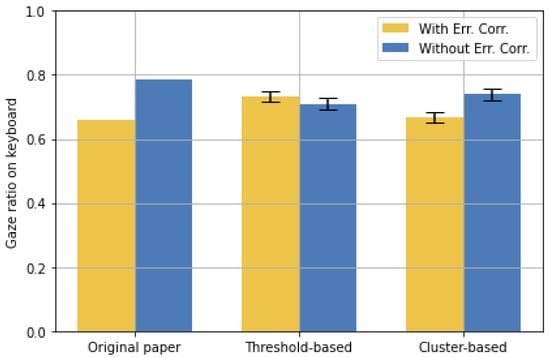 As before, Jiang et al. do not provide exact values for the breakdown across sentences that contain error corrections and those that do not. From the related figure, the mean number of keyboard gaze time ratio is <0.70 ( 0.65) for sentences with error corrections and at around 0.75 () for those without. Using the threshold-based method, we find mean values at (with errors) and (no errors), while the cluster-based method shows mean values at (errors) and (no errors), as shown in Figure 12.