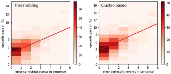 Finally, I examined the presence of correlations in the number of upwards gaze shifts and the number of errors made in any sentence. A Spearman’s correlation test, due to the distribution of errors which did not meet normality criteria, showed that a strong and statistically significant correlation can be uncovered with both the thresholding () and the cluster-based algorithms (), as can also be seen in Figure 13.