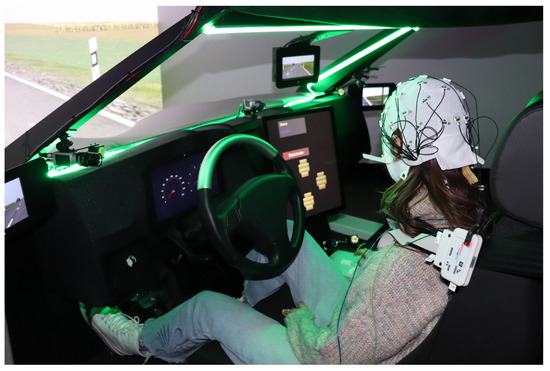Performance-based (e.g., reaction time [31], vehicle jerk [11]) and self-assessment (e.g., questionnaires [32], and interview [33]) methods have been traditionally used to assess driver’s cognitive states. With the development of low-cost, non-invasive sensors, psychophysiological measures became more available to be employed in driving research [34]. Electroencephalography (EEG) is perhaps one of the most widely used psychophysiological methods to study the neural indices of cognitive effort and attention allocation in the driving context. The most common use of EEG in the driving context is to study brain activity during states of mental over- or under-arousal (for a recent review, see [35]). Employing psychophysiological measures allows for assessing cognitive states continuously, unobtrusively, and without disturbing the real-time task. Therefore, psychophysiological measures provide an additional value when combined with subjective and performance-based measures [34].