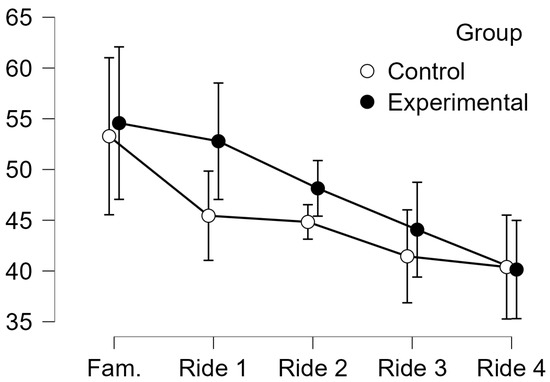 The perceived MW was measured using the DALI questionnaire [32]. We administered the questionnaire at five time points: after the simulator familiarization and after each of the four experimental rides. Using a mixed factor ANOVA with the Greenhouse–Geisser correction, we found a significant main effect of time (F (1.78, 53.32) = 9.40, p < 0.001, ). A Bonferroni corrected post-hoc test showed that there was a significant decline in perceived MW between the familiarization and Ride 2 (p = 0.03), Ride 3 (p < 0.001), and Ride 4 (p < 0.001). Moreover, we found a significant decline from Ride 1 to Ride 4 (p = 0.01). There was neither a main effect of group (F(1.00, 30.00) = 0.33, p = 0.57) nor the interaction (F (1.78, 53.32) = 0.66, p = 0.50). This finding suggests that the perceived MW was comparable for participants with the ambient light and without the ambient light. The data are presented in Figure 2.