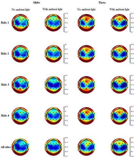 To measure the objective MW, we analysed the relative frontal theta power and the relative parietal alpha power. The Task-Load Index (TLI) [48] was calculated as a quotient of frontal midline theta divided by parietal midline alpha. Figure 3 shows the topographical distribution of alpha and theta power over each of the four rides and the entire experiment.