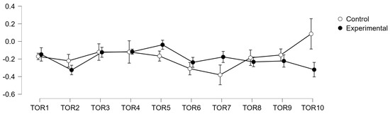 Using a mixed-factor ANOVA with the Greenhouse–Geisser correction, we found a significant main effect of time (F (3.53, 123.51) = 7.23, p < 0.001, ) and a significant effect of the interaction between time and group (F (3.53, 123.51) = 9.71, p < 0.001, ). There was no main effect of group (F (1, 35) = 0.02, p < 0.897, ). The table with results of Bonfferoni post-hoc tests can be found in Appendix A.