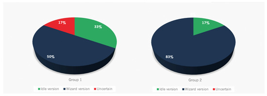 The preference rate of the wizard-enabled version was uniformly high across the two groups, as shown in Figure 3; this version was preferred by 8 participants out of 12 (67%) in total, whereas the idle version was preferred by 3 participants out of 12 (25%). One participant declared that he did not have any preference. Note that in both groups, no matter the order in which learners interacted with the system, most of them favored the system which displayed nonverbal emotional feedbacks. In fact, among reasons justifying their choices, participants who preferred the wizard version frequently mentioned that they found the way the virtual agent Truly reacted to their talk to be encouraging, especially when they were struggling to find appropriate words to express what they were trying to say.