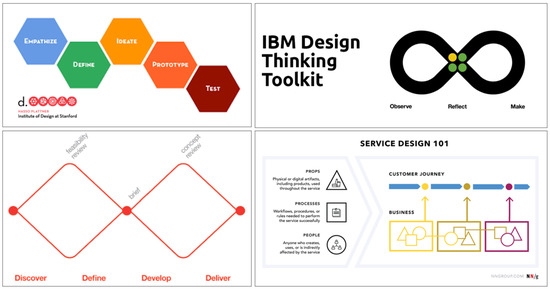 Examples of some human-centred design frameworks. From the top-left: design thinking, Stanford; IBM Design Thinking; double-diamond British Design Council; service design 101.