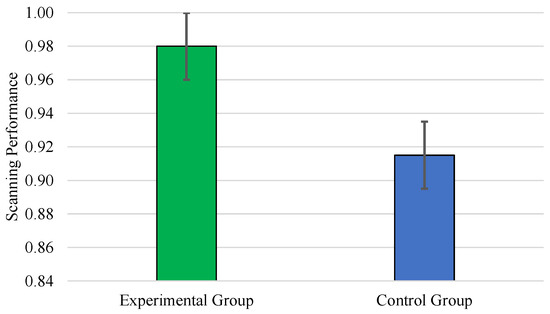 As illustrated in Figure 4, the scanning performance in post-test was significantly affected by the type of training [F(1, 37) = 6.11, p < 0.02, = 0.14]. The experimental group (Mean = 0.98, SE = 0.02) performed better than the control group (Mean = 0.92, SE = 0.02). The gender effect [F(1,37) = 2.79, p < 0.10, = 0.07] and the interaction term gender and group [F(1,37) = 1.10, p < 0.30, = 0.03] did not reach statistical significance.