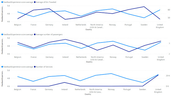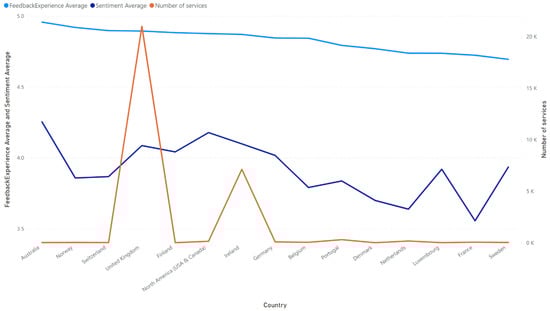 For instance, the results of sentiment analysis algorithms are usually expressed from −1 to +1. This makes it possible to compare the values of consumers’ opinions expressed in the various variables related to feedback (scored between 1 and 5). To make the comparison, sentiment normalisation was performed on a scale between 1 and 5. Considering only the countries with at least ten services, Figure 6 relates the sentiment obtained from the tourists’ comments with the feedback attributed to the experience and the number of services requested by consumers in each country.