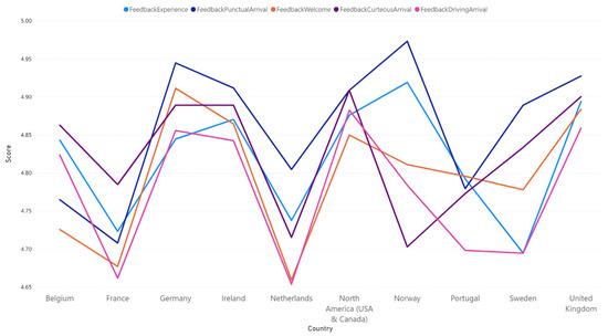 Figure 2 compares the average of FeedbackExperience with the average of FeedbackPunctualArrival, FeedbackWelcome, FeedbackCurteousArrival, and FeedbackDrivingArrival. To complement the exploratory analysis, in this figure, there is no variable with identical behaviour to the FeedbackExperience (i.e., a variable that helps to explain the FeedbackExperience values). However, it appears that certain countries may have similar behaviours, which will be analysed by the correlation between the variables using Pearson’s correlation coefficient.