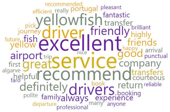 - Cloud of words, shown in Figure 4, considers the FeedbackComments to study customer satisfaction with tourism transport services. The text mining analysis was performed on 29,339 comments. Given that the size of the words represents the frequency of the words in the services’ commentaries, it is possible to see that some of the words with higher frequency were: “service”, “excellent”, “recommend”, “friendly”, and “great”, among others.