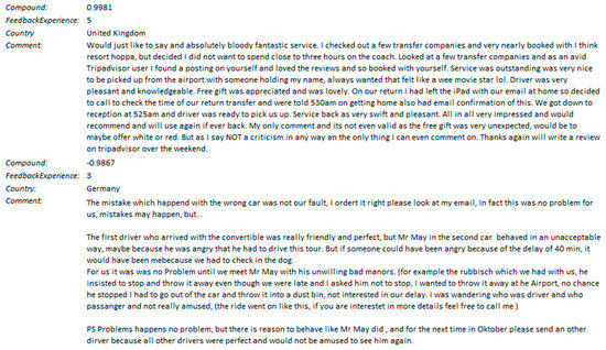- Sentiment Analysis evaluates the sentiment associated with service comments. The VADER algorithm was used for this analysis [58], which produces a result between −1 (most negative sentiment) and +1 (most positive sentiment). Consequently, the results present a “sentiment value” for each comment, which is within the range of values described, where the most positive comment had a sentiment value (compound) of 0.9981, which has an associated value of 5.0 in the FeedbackExperience variable and which corresponds to the text shown in Figure 5. The most negative sentiment was the value of −0.9867, which is associated with a FeedbackExperience of 3.0, whose comment is also represented in Figure 5.