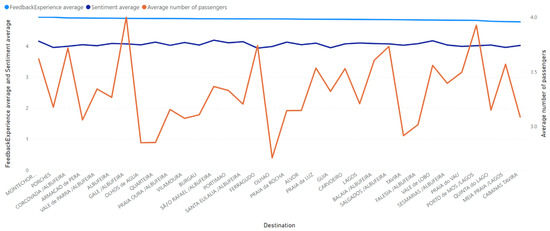 Considering destinations with at least fifty services, the analysis presented in Figure 7 compares the average assessment of the sentiment analysis and the feedback of the experience grouped by country. In the same figure, it is possible to see that the number of passengers is not correlated with experience or sentiment. There is no difference from destination to destination because values are close.