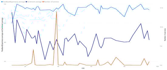 The distance covered can also be an analysis factor for a tourist transport company. Therefore, Figure 8 compares the average sentiment with the average associated with the feedback of the experience with the kilometres travelled, without ignoring the number of services performed for each distance. Only the services performed in the Algarve (up to 100 km away) were considered. It can be concluded that distance does not affect the appreciation of experience or feeling, nor is it related to the number of services performed. In this analysis, it is also possible to conclude that there are distances covered where the associated sentiment has lower values, such as happens at kilometres 32, 43, and 58. Therefore, the tourist transport company should investigate the reasons that lead to these feelings.