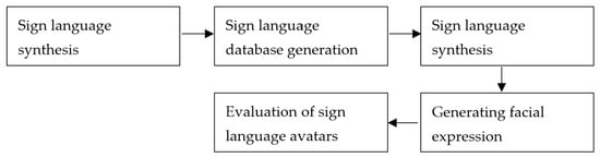 Many reviews and surveys have been conducted on the topic of sign language processing, but no in-depth literature review has been conducted on sign language avatars. A survey paper by [] provided a systematic review of the standard and contemporary techniques used for sign language machine translation and generation. Their study discussed sign language machine translation models, sign synthesis techniques, and evaluation methods for these models. Another study reviewed the different dimensions of the sign language translation problem []. One of the dimensions discussed was avatar technology. Although the review described the avatar generation process and presented a background on the avatar technology, it did not go into depth with the different phases of the avatar generation process and the challenges that arise within them. Ref. [] also touched on the existing state of avatar technology as part of their systematic review on sign language production. Ref. [] surveyed the different textual representation techniques for sign language avatars and presented a comparison of these techniques. Ref. [] conducted a survey on the sign language avatars with a focus on the challenges in the development of sign language avatars and sign synthesis. Their survey covered the different approaches adopted to represent signs in the literature. However, it did not go into depth with discussing facial expressions and the animation of the sign language avatars. Ref. [] surveyed facial expressions as part of the sign language animation process and compared different state-of-the-art approaches to facial expression generation in sign language projects.
