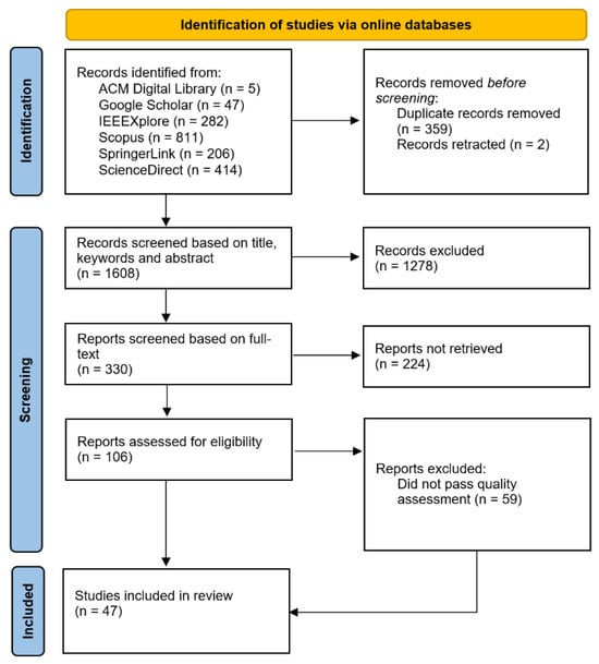 The initial screening resulted in 330 papers being retained. The papers then went through full-paper screening where the first author, referred to as Reviewer 1, screened the paper as to whether they answered the research questions mentioned in Table 1. The papers were assigned one of three labels, “include”, “maybe”, and “exclude”. When the paper was voted as “maybe”, Reviewer 1 and Reviewer 2 (second author) would have to come to a consensus on whether the paper needs to be included or not. A total of 39 papers were found to have no full-text availability. After the full-text screening, 106 papers went to the quality assessment stage. Figure 2 shows the PRISMA flow diagram for the selection process of the literature.