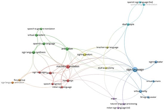 Keyword analysis was performed using VOSviewer 1.6.19 [], a text-mining technique that constructs co-occurrence networks of keywords. A threshold of two was instituted, implying that keywords must appear a minimum of twice in the bibliometric analysis for inclusion. After meticulous manual data collection, 27 keywords out of an initial 150 were shortlisted for the final analysis. The co-occurrence network derived from these keywords, as depicted in Figure 3, unfolds into seven distinct clusters, showcasing varying degrees of keyword interrelations. Within these clusters, ‘sign language’ prominently stands out as the pivotal keyword, accentuated by the size of its circle. This revelation indicates the diverse thematic concentrations present in the realm of sign language avatars, emphasizing the multifaceted and interlinked nature of research in this domain. For a more granular understanding, Table 7 delineates the frequencies of the top keywords and their proportional representation among the chosen studies.