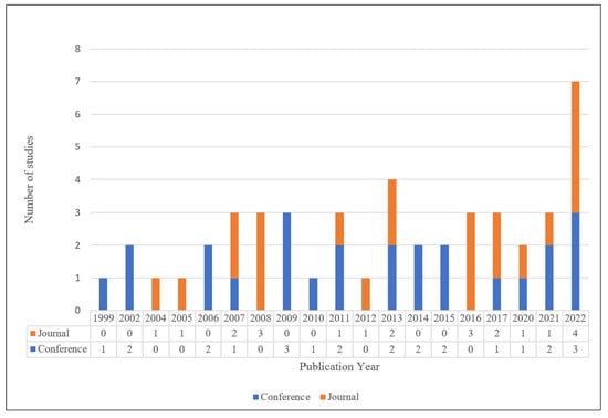 Figure 4 displays the distribution of studies spanning the years 1982 to 2022. From this distribution, an ascendant trajectory in the aggregate number of papers released in both conferences and journals becomes palpable. A notable peak is observed in 2022, marking the zenith of published papers within this timeframe. Delving deeper into the annual publication metrics, we notice variability: conferences consistently outpace journals in terms of publication frequency. To illustrate, 2013 saw four papers, while three papers were disseminated during 2007–2009, 2011, 2016–2017, and 2021. In parallel, two papers were promulgated during 2002, 2006, 2014–2015, and 2020. On the more modest end of the spectrum, solitary publications were recorded in 1999, 2004, 2005, 2010, and 2012. It is worth noting that select years, namely 2001, 2003, 2018, and 2019, registered a complete absence of pertinent publications.
