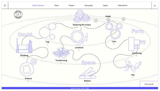 The research project “Atlante Calvino: Literature and Visualization” (https://atlantecalvino.unige.ch/ (accessed on 14 June 2023)) (Figure 1) was funded by the Swiss National Fund (2017–2020) and was developed by an interdisciplinary team of literary scholars from Unité d’italien de l’Université de Genève and information designers from DensityDesign, Politecnico di Milano. As Mondadori, the publishing house, holds the rights to Calvino’s entire oeuvre, they, too, took part in the research project.