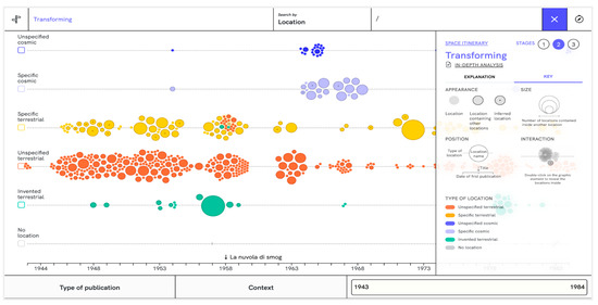 The places are organized into three categories: specific terrestrial (they can be found by using geographic coordinates) and no specific terrestrial; specific cosmic (they can be found in the cosmos) and no specific cosmic; invented terrestrial (a generic space that does not exist, although it is inspired by a real one) and finally anywhere. The places are represented as circles of different colors according to the different categories; on the horizontal axis, one can find the publication dates, while, on the vertical axis, the six above-mentioned categories are provided. The analysis of these data shows the relationship between Calvino and realism, as well as the gradual detachment from reality in his novels.
