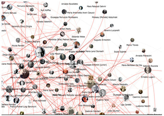 Firstly, the historical–relational dimension among people, places, and events studied by the humanists (historians and archivists) and narrated by the archive is made explicit through the visual interface. The interactive and dynamic interface graphically showing the protagonists of the history of Italian psychology and the “quality” of their relationships is a means of making such connections visible (Figure 4).