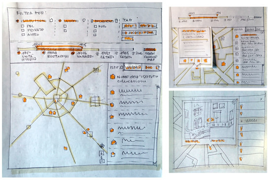 (b) The people involved were mainly from the humanistic field, i.e., historians, archivists, and librarians, and shared a relatively negative attitude towards digital technologies. Different graphic approaches were adopted to overcome the cognitive friction among the participants and the internal stakeholders, as well as in the participatory activities and qualitative assessment. Visual facilitation, sketched wireframes (low fidelity in terms of final coded interface/front-end, but with a strong look&feel impact) were explored and successfully adopted to make the co-design workshops accessible to future users such as archivists and curators (Figure 5).