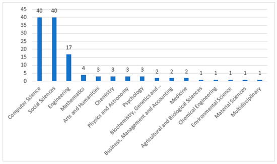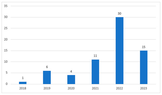In order to make this review as inclusive as possible, the collected papers were selected without examining their subject area. This way, the final set of documents originated from various subject fields like Computer Science, Chemistry, Mathematics and many more, as can be seen in Figure 2. Articles were only limited based on the publication year since this review focuses on the latest advancements around this specific topic. The final list consisted of 67 total papers, with 66 documents included from the search results and 1 [24] retrieved using backward searching; the latter was relevant to ChatGPT, which was considered an important CA relevant to the latest developments. The distribution of the collected papers is displayed in Figure 3 where an increasing interest in the subject can be noticed. Though, 2023 is not very high in comparison to 2022, and that is possibly because the search was performed in the first third of 2023.