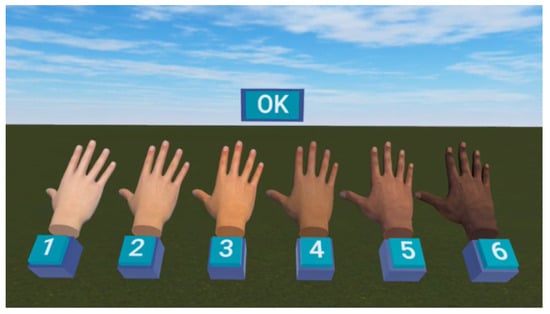 Participants were offered a selection of hand textures attained from the ‘Hafnia Hands’ resource [], which covered all six skin-tone levels of the Fitzpatrick scale []. This set of hand textures has proven instrumental in numerous embodiment and remote VR studies, consistently demonstrating its capacity to heighten participants’ sense of body ownership, particularly when the chosen ‘Hafnia hands’ closely resembled the participants’ own skin tone.