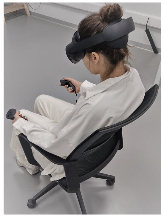 The VR experimental application was developed in Unity 3D Software (version 2022.2.7f1) [] and presented with Meta Quest Pro head-mounted display (HMD) (standalone, resolution 1800 × 1920 pixels per eye, 106° horizontal and 96° vertical field of view, 90 Hz refresh rate). Additionally, it included eye-tracking functionality.