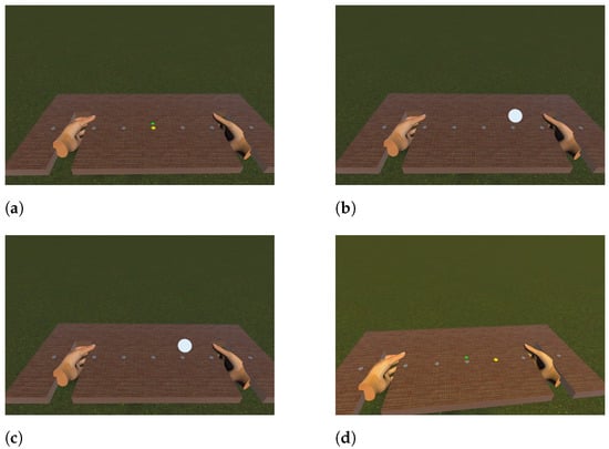 Participants underwent a pre-training session to familiarize themselves with the two phases of the experimental task, as illustrated in Figure 4. The task encompassed a visual feedback phase and a no visual feedback phase. In the visual feedback phase, each trial commenced with a central green dot serving as a fixation point (a). Participants then received real-time visual, haptic, and auditory feedback regarding the ball’s position (b), facilitating precise ball localization. Participants maintained their gaze on the ball’s location until the next trial (c), where their responses were recorded. The end of each trial was marked by a yellow environmental light flash, signaling the start of the next one (d). During the subsequent no visual feedback phase, the same sequence of stages was followed. Participants focused on the fixation point (a), but, this time, they received solely audio–vibrotactile feedback (no visual) regarding the ball’s position (b). Their task was to estimate the ball’s location. Gaze direction was maintained until the next trial (c) to record localization responses, and a yellow environmental light flash marked the end of each trial and the beginning of the next one (d). The key distinction was that the experimental group received haptic feedback inducing the funneling effect in both phases, whereas the control group received haptic feedback without funneling in both phases.