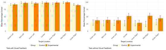 Descriptive statistics were computed to summarize the data. During the localization task, participants’ performance was assessed in two distinct phases. The initial phase, which established baseline measures with visual feedback, revealed that the experimental group achieved an average accuracy of 96.25% (), 95% confidence interval (CI): [92.85%, 99.65%], while the control group reached a similar accuracy of 96.43% (,  . In the subsequent phase of the experiment, where visual feedback was removed, the experimental group maintained an average accuracy of 41.79% (,  , while the control group exhibited a lower average accuracy of 28.21% (,  . The bar plots presented in Figure 5 offer a visual comparison of correct response rates across seven target locations, considering participant groups (experimental vs. control) and experimental conditions (visual feedback vs. no visual feedback).
