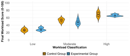 Violin plots with boxplots compare final workload scores among participants categorized into low, moderate, and high workload classifications for the control and experimental groups. Workload classifications are based on NASA-TLX scores, with ‘Low’ indicating lower workload, ‘Moderate’ for intermediate workload, and ‘High’ indicating higher workload.