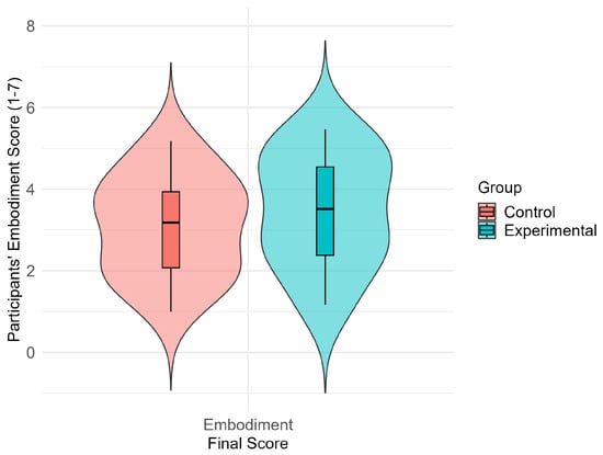Figure 7 visually represents the distribution of final embodiment scores for both the control and experimental groups using violin plots with overlaid boxplots. The key statistics displayed in each group’s boxplot include the median (indicated by a bold black line), upper and lower quartiles, and any potential outliers. The control group exhibits a wider spread of scores and a slightly higher median compared to the experimental group. A Welch’s two-sample t-test was conducted to assess the statistical significance of the difference in final avatar embodiment scores between the experimental and control groups. The results revealed no significant distinction in avatar embodiment scores between the two groups (, ),  , suggesting insufficient evidence to conclude a true difference in these scores.