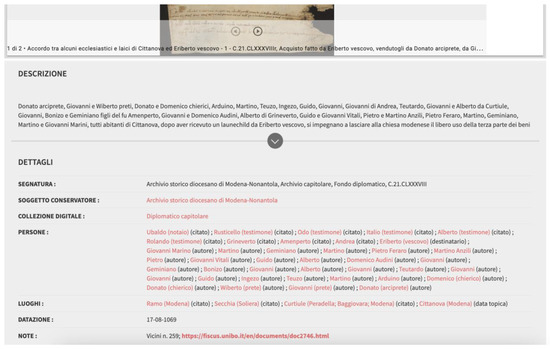 A similar logic is employed to enable collaborations with overtly specialist projects. This is the case with the Fiscus project, which aims to study the economic and patrimonial dimensions of public powers in Italy in the Late Middle Ages (https://fiscus.unibo.it/en/, accessed on 20 November 2023). Fiscus has created a specific database, in part furnished with digitised documents: some of these—scrolls relating to the geographical area of interest of Lodovico—have been “shared”. The highly detailed and analytical data on Fiscus has been simplified and condensed for its export onto Lodovico, which, in turn, in the field reserved for notes, is able to provide a link back to the descriptive entries of Fiscus (Figure 3). Once again, this reciprocity derives not from the similarity of the projects but their complementary nature: Fiscus is a specialist project with data deriving from in-depth research and analysis; Lodovico, meanwhile, aims to provide simple information that facilitates interconnections. The sharing of information and reciprocal references via urls enriches the two projects and, above all, enables them to reach different audiences: Fiscus becomes visible to the general public, while Lodovico reaches a highly distinct target with specific demands.