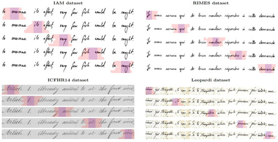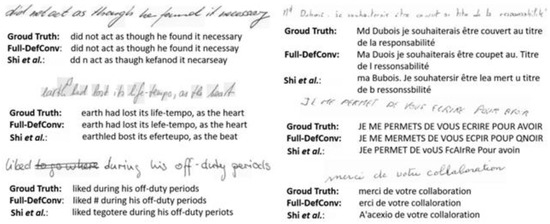 Starting from the created datasets and others available in the literature, Deep Learning architectures for HTR have been developed. This research activity was based on the emerging Deformable Convolutional Network, which were originally designed for object recognition and segmentation (cf. Cojocaru et al., 2021 [32]). These types of algorithms are robust to non-idealities of paper support and are able to dynamically adapt to variations in the shape and size of characters. Before the appearance of our approach, DefConvs have indeed been employed for the task of object recognition, showing great adaptability to geometric variations and to part deformations, and the ability to model transformations in the object scale, pose, and viewpoint. To the best of our knowledge, we have been the first to investigate the usage of of DefConvs for handwriting recognition. Their kernel adaptability, indeed, helps to improve the efficiency and the performance in the task. We refer the reader to (Cojocaru et al., 2021 [32]) for further details on the architecture and training modality, but a qualitative example is shown in Figure 5, on test set lines of the IAM (Marti et al., 2022 [33]) and RIMES (Augustin et al., 2006 [34]) datasets, in comparison to the approach proposed by Shi et al. (Shi et al., 2016 [35]), a popular approach for HTR (see also Figure 6).
