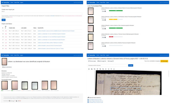 Moreover, in the context of the Lodovico project, we also developed a demo of the automatic annotation results. This is publicly available (https://ailb-web.ing.unimore.it/hwr, accessed on 20 November 2023), under the name of “Transcribe” platform (Figure 7). In addition to showcasing results, the platform can also be used to annotate new data. Finally, preliminary tests of text recognition from the pages of the Cronache Modenesi by Spaccini were also conducted using the developed models, and are available on the interface.