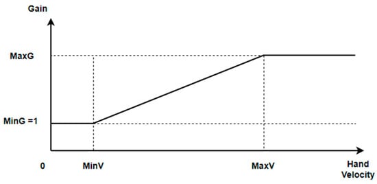 When using a force-feedback device for kinesthetic interaction in a virtual environment, we commonly adopt the unit CD gain (=1), that is, a 1 cm physical movement of the mechanical arm resulting in a 1 cm movement of the HIP, along the x-, y- and z-axes. This ensures that the user has a sufficient workspace (smaller gains would make the device workspace too small and thus difficult to use) and a good control over the HIP []. Therefore, we used the unit CD gain as the minimum CD gain (MinG) with a predefined minimal velocity threshold (i.e., MinV = 0.05 m/s) for the dynamic CD gain. The minimum gain was applied when the hand movement speed was at and below this minimal velocity threshold. We did not set a “still” phase for the force-feedback device as in the PRISM technique (i.e., set the minimum gain at 0). This was because of the sensitivity of the force-feedback device, which is already filtering out unwanted movement noise. Following the increasing speed of hand movement, the gain was linearly increased until the hand movement speed reaches the maximum velocity threshold (i.e., MaxV = 0.25 m/s). Then, the maximum gain (MaxG) was applied, even after hand speed exceeded the maximum velocity threshold. In this study, the maximum gain value is varied as an independent variable in the experiment. The interaction mode of velocity-oriented dynamic CD gain is shown in Figure 1.