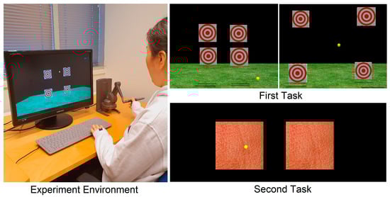 Experiment environment with two kinesthetic tasks shown on the display screen, and the left image of the first task is an example of the easy-to-reach task and the right one is an example of the difficult-to-reach task.