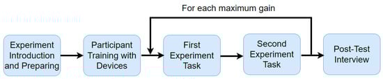 The participants were asked to finish the first experimental task as accurately and quickly as they could. In the second task, they were only allowed to compare two tissues up to three times. There were six experimental conditions (maximum CD gains) in the experiment and the order of experimental conditions were counter-balanced among the participants. For each CD gain, the participants had up to one minute to familiarize themselves with the used CD gain. Then, they were asked to finish the first experimental task with six trials and then the second task with twelve trials. After that, they could have up to two minutes to rest their hand before the next group of trials. We did not provide any feedback regarding their task performance. After completing the tasks with all CD gains, the participants commented on the technique of velocity-oriented dynamic CD gain, and their comments were recorded in the questionnaire. In total, the experiment time for each participant was approximately one hour. The experiment procedure for participants is shown in Figure 3.