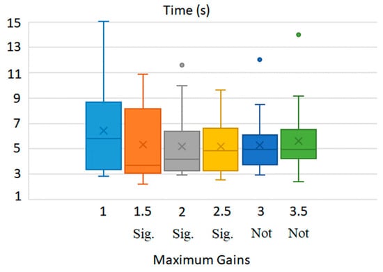 Task completion times based on the maximum gains (the line in the boxplot is the median value and the cross mark is the mean value).