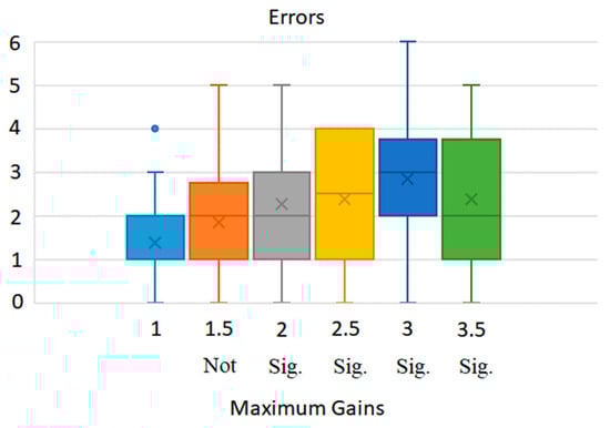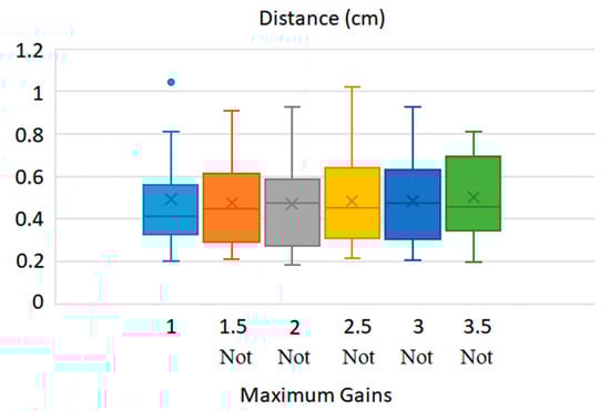 For error distances, The ART ANOVA test showed that there were no statistically significant differences for the different maximum gains, the levels of reach difficulty and their interaction effect. Figure 5 shows the boxplot of the error distances based on maximum gains. Table 3 shows their mean values and standard deviation values.