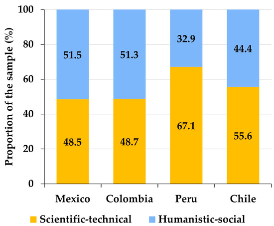 Participants were homogeneously distributed by country (chi-square = 0.9652, df = 3, p-value = 0.8097): Mexico (26.54%), Colombia (24.64%), Peru (24.96%), and Chile (23.85%). However, the gender distributions were not equivalent in the different countries (Figure 1), since, while in Chile, Colombia, and Peru the participants were distributed approximately homogeneously by gender, in Mexico there was a significant majority of females (chi-square = 12.6430, df = 3, p-value = 0.0055). Likewise, the participants in Colombia and Mexico were distributed approximately homogeneously by areas of knowledge, with a slight majority of teachers from humanistic-social areas, while in Chile and Mexico there were more professors from scientific-technical areas, this majority being larger in Peru (Figure 2). These differences between countries in the distribution of participants by knowledge areas are statistically significant (chi-square = 17.3230, df = 3, p-value = 0.0006).
