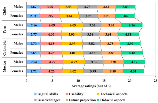 The digital gender gap that disadvantages females that occurs in general in Latin America [32,33,34] manifested in all PA countries, as male professors expressed higher self-concepts of their digital skills than females in all of them (Figure 3). However, this paper evidences, as a novel and original result, that the behavior of the gender digital divide in terms of VR ratings is different depending on the PA country in question. Specifically, in Mexico and Peru, male professors rate the technical and didactic aspects of VR higher than females, while in Colombia and Chile it is female professors who rate VR higher (Figure 3). In Mexico, male professors are those who perceive more future projection and fewer disadvantages for VR, while in Peru, males perceive more disadvantages.