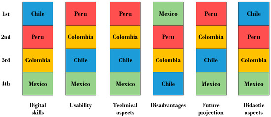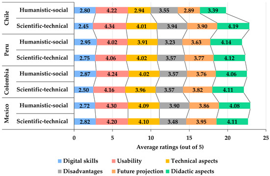 The area of knowledge was an explanatory variable for all the families of responses obtained (Figure 4). Professors from humanistic-social areas expressed higher self-concepts of their digital skills than professors from scientific-technical areas in all PA countries except Mexico (F = 4.4621, p-value = 0.0004). Regarding the ratings of the different dimensions of the RV, participants from scientific-technical areas in Chile gave higher ratings than their colleagues from humanistic-social areas—36.4% more in technical aspects, 11.0% more in disadvantages, 34.9% more in future projection, and 23.6% more in didactic aspects—while in the rest of the PA countries there was a balance in the ratings given by professors from the two areas analyzed (Figure 4).